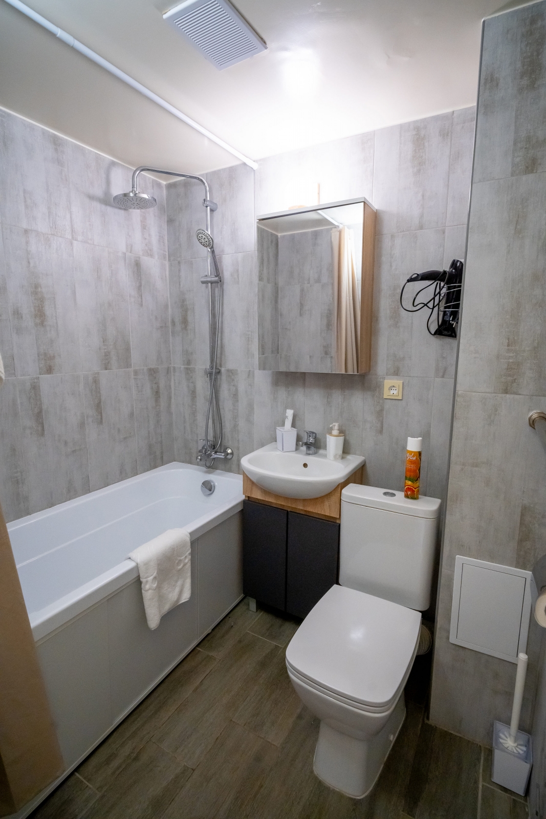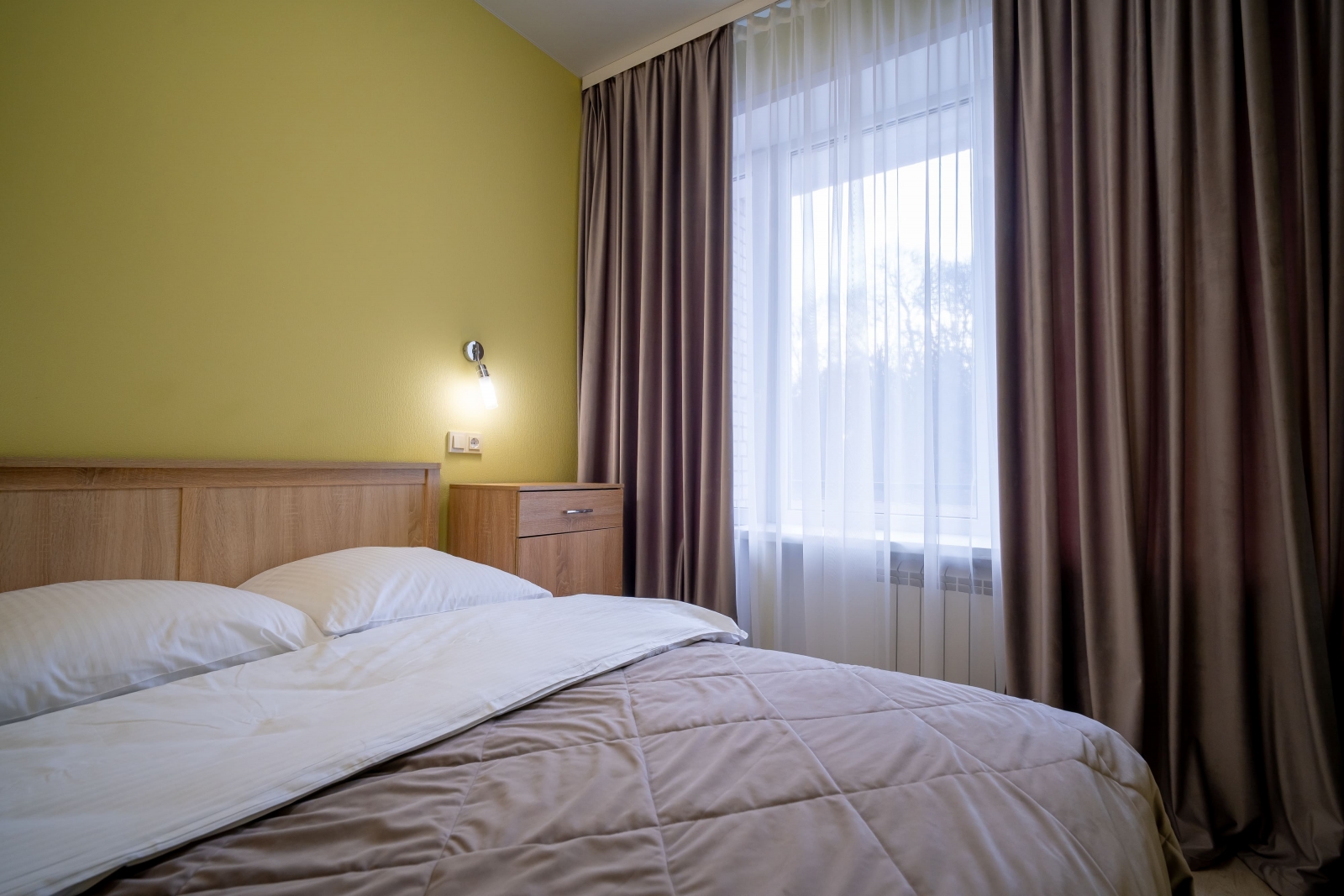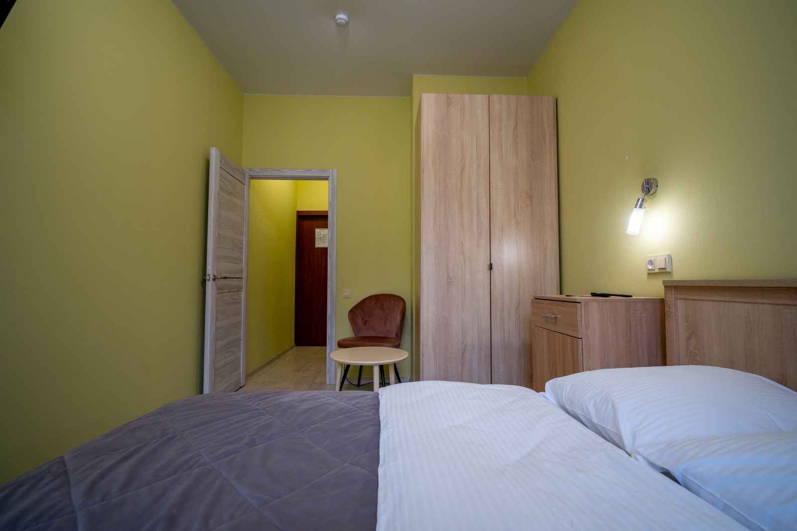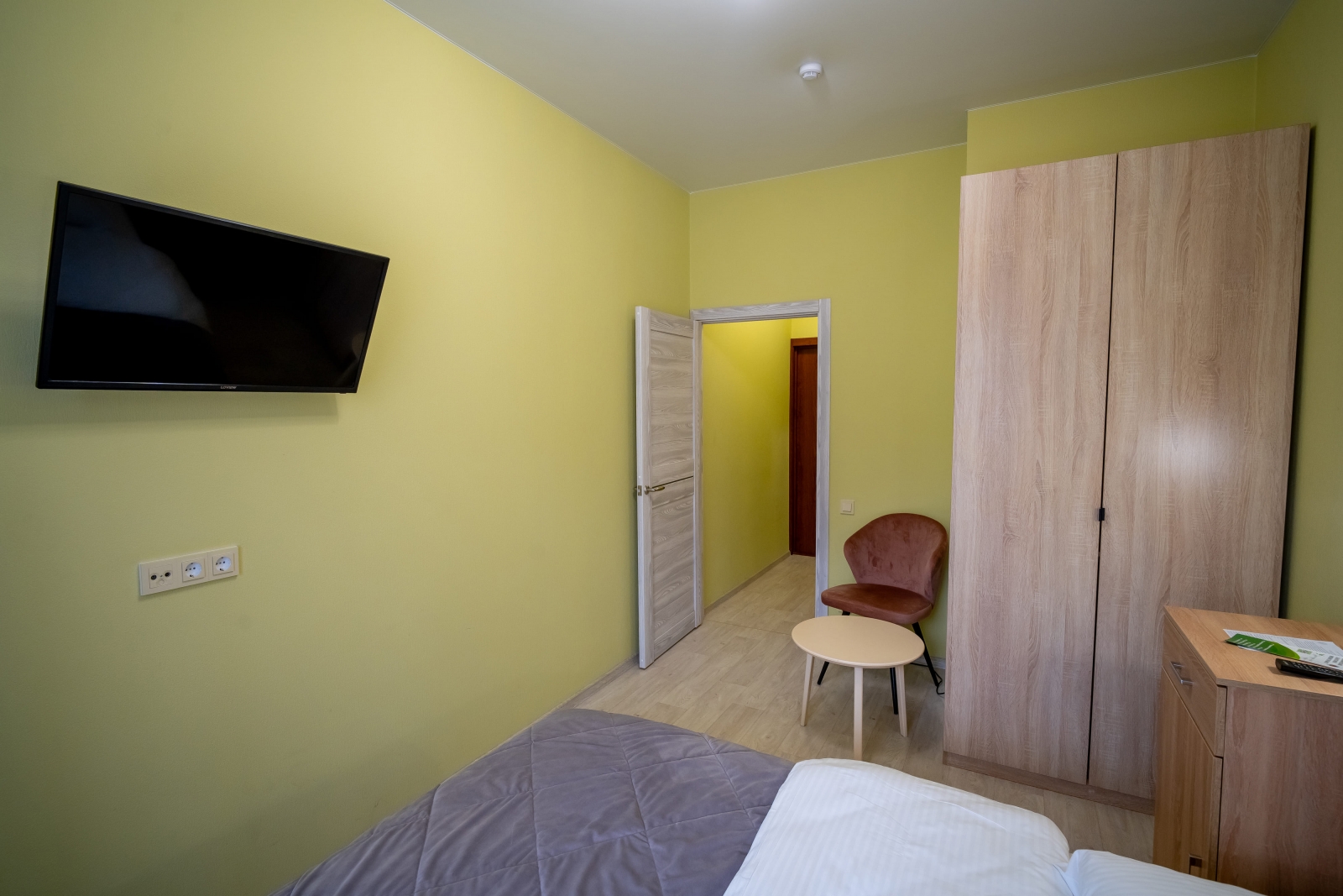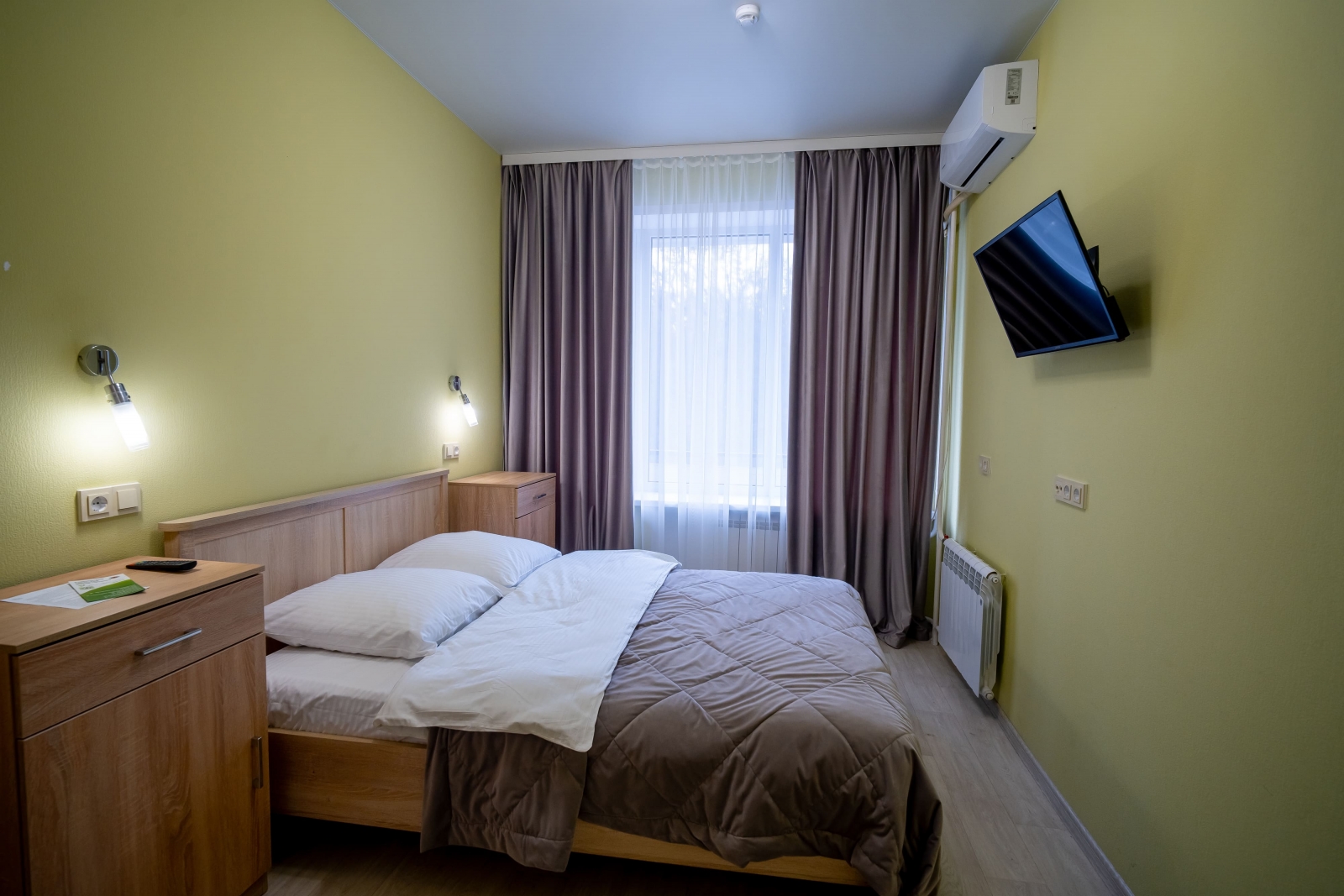 Светлый номер с современным дизайном и ремонтом, площадью 19,5 кв.м. В номере большая двухспальная кровать, а также: