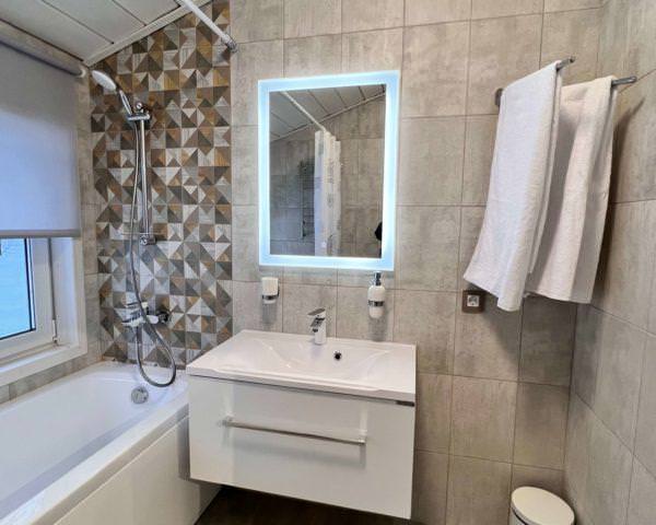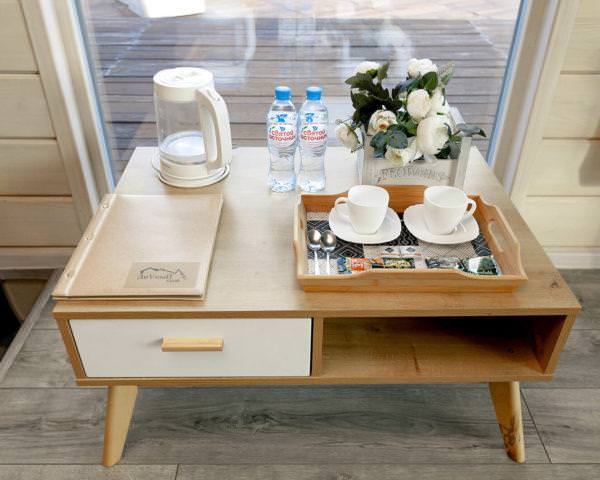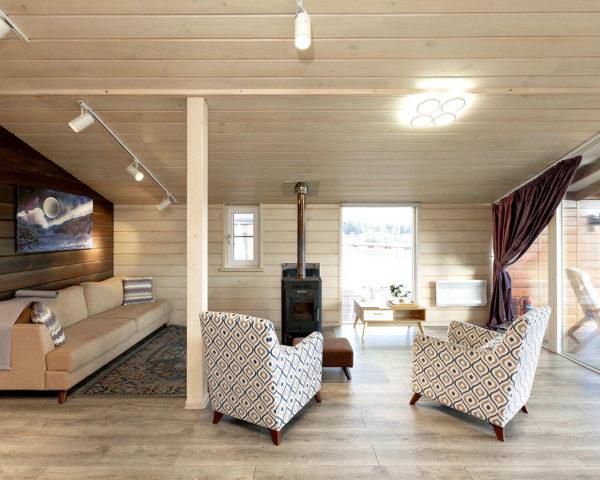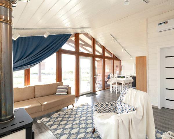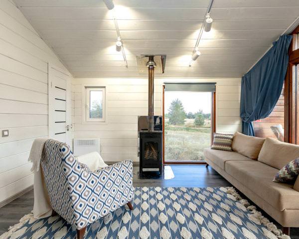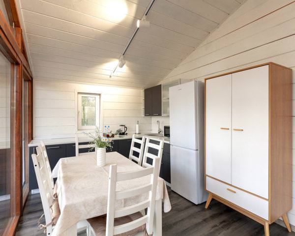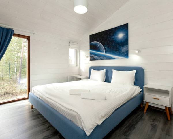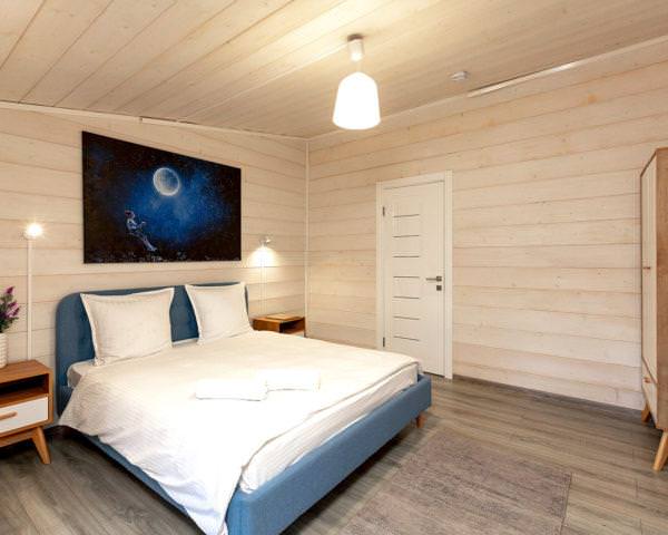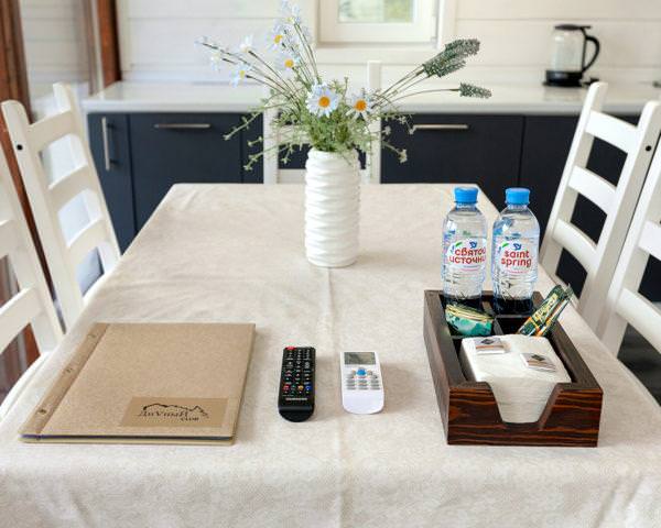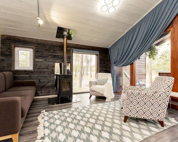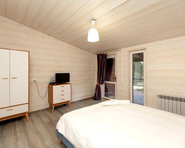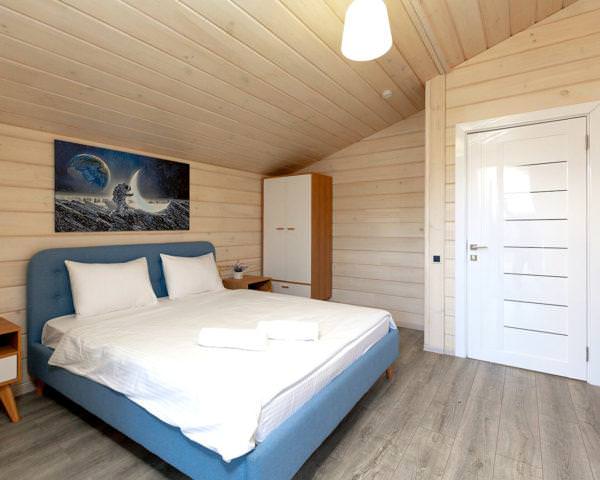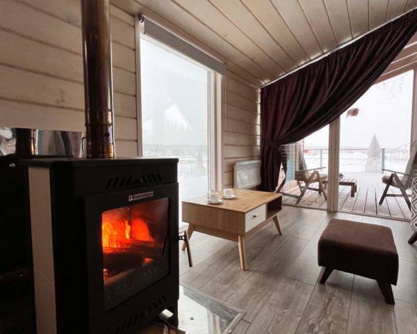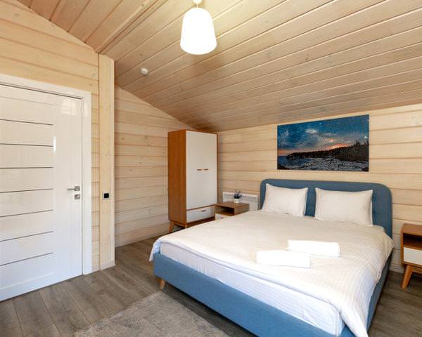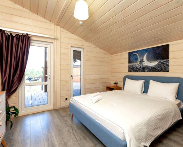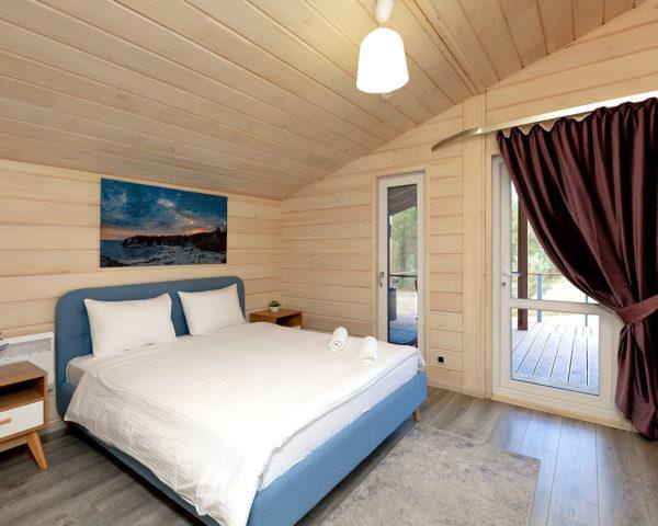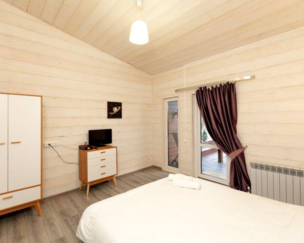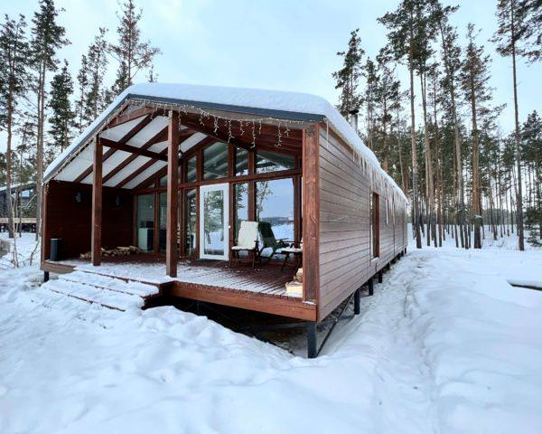 Уютный дом в стиле Шале-модерн с панорамными окнами располагается прямо на озере, с большой спальней, собственной террасой и ванной с панорамным окном. В распоряжении гостей кухня с обеденным столом и уютная гостиная с камином и диваном. Просторная крытая терраса с выходом к мангальной зоне позволит комфортно устроить пикник или пить чай созерцая красоты окружающей природы. Дом оборудован кондиционером.