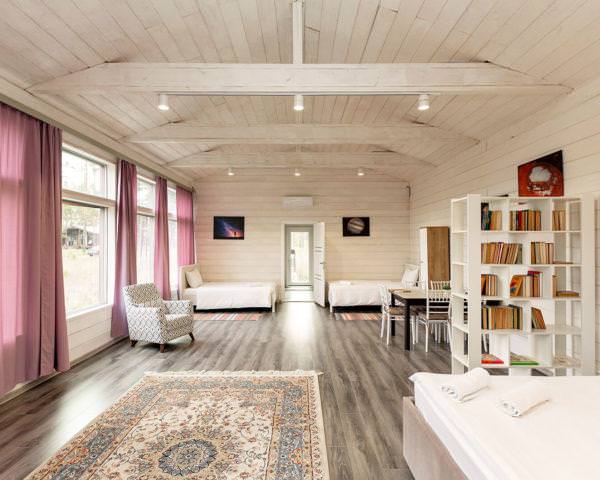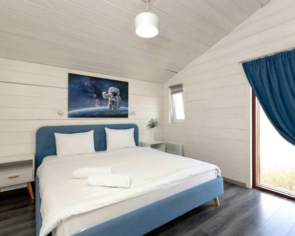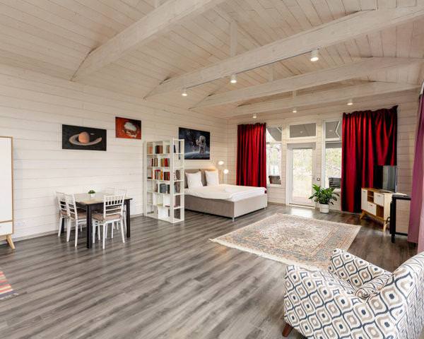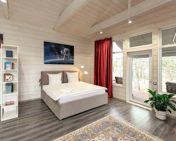 Дом с шикарной высокой двуспальной кроватью и видовыми витражными окнами! Просторный зал с книжными полками и камином позволит уютно встретить вечер у огня. Дом оборудован всеми удобствами, имеется собственная кухня, терраса, мангальная зона, система кондиционирования.