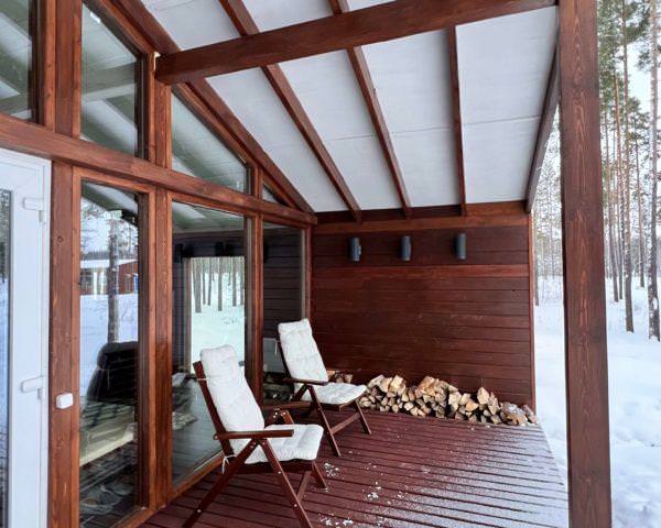 Просторный дом в лесу в стиле Шале модерн с панорамными окнами, с 2 спальнями с собственными террасами и ванной с панорамным окном, большой кухней и уютной гостиной с камином. Просторная крытая терраса с выходом к мангальной зоне позволит комфортно устроить пикник или пить чай созерцая красоты окружающей природы. Дом оборудован кондиционером.