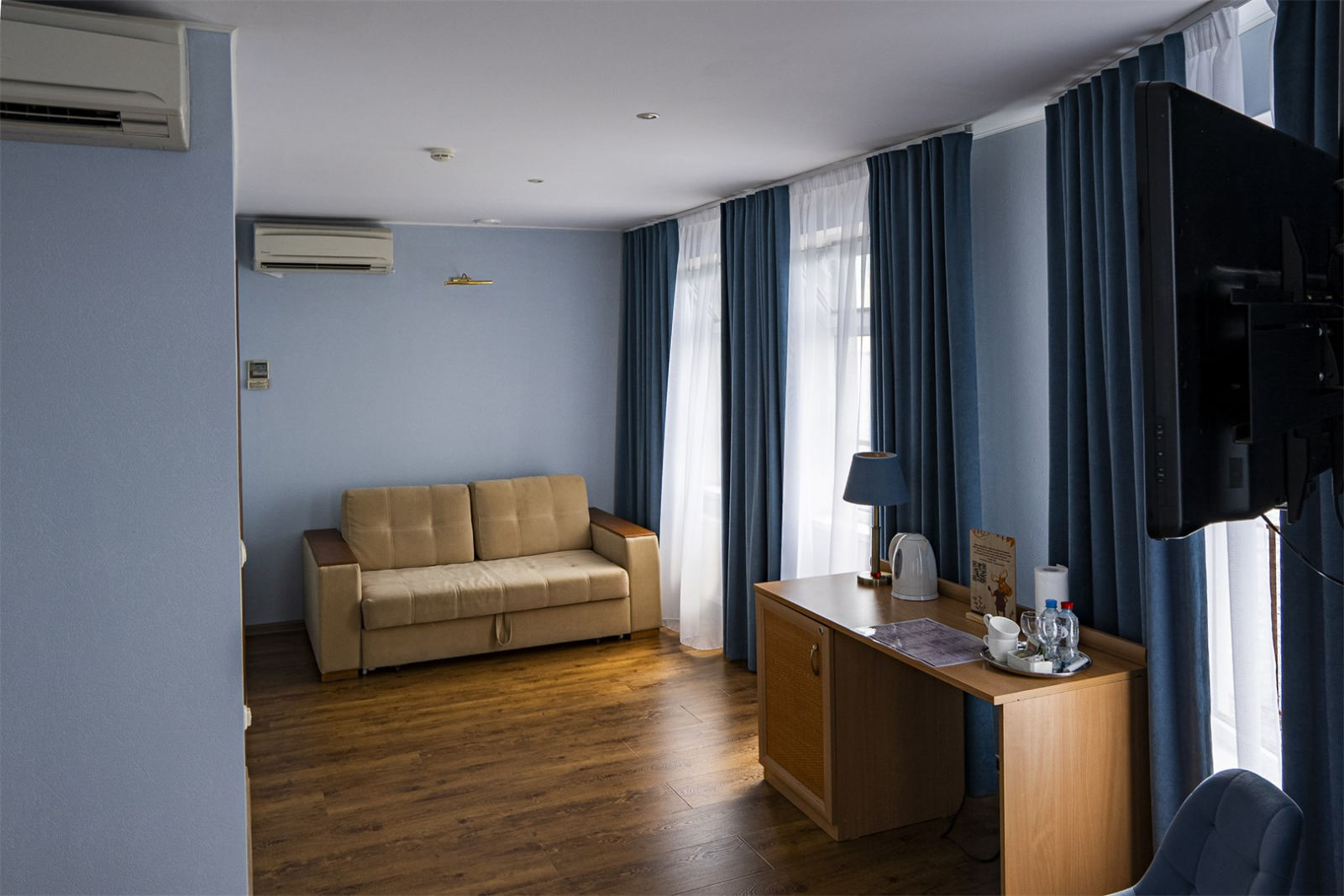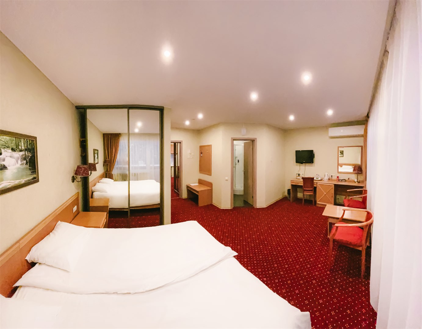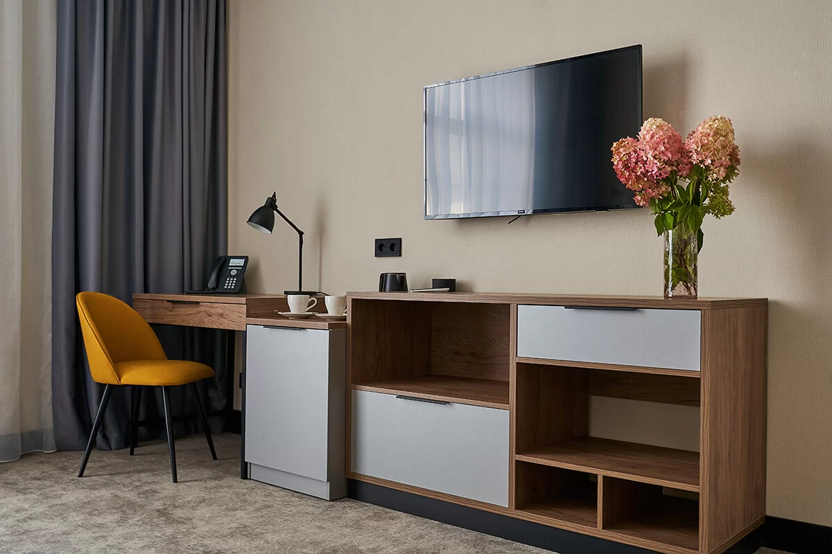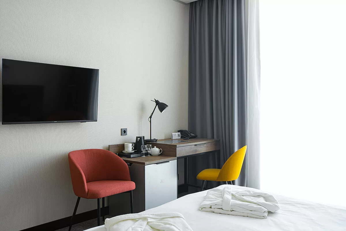 Номер оснащен телевизором и удобной современной мебелью, обеспечивая гостям комфортные условия для отдыха и рабочих моментов.