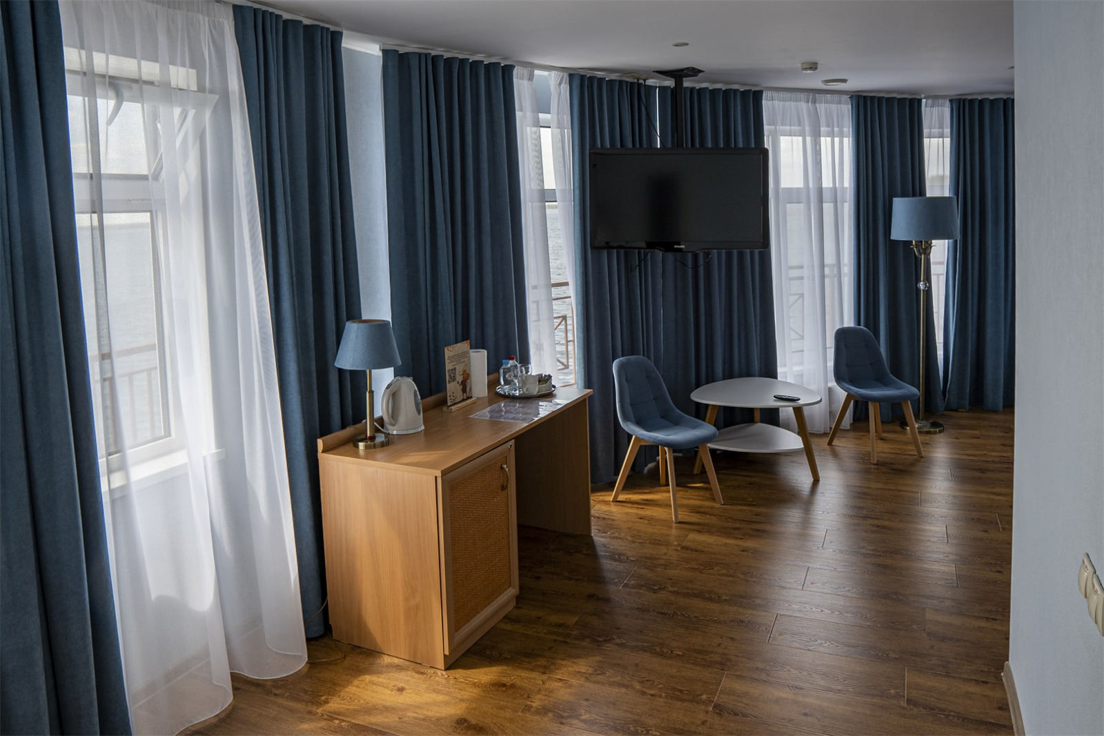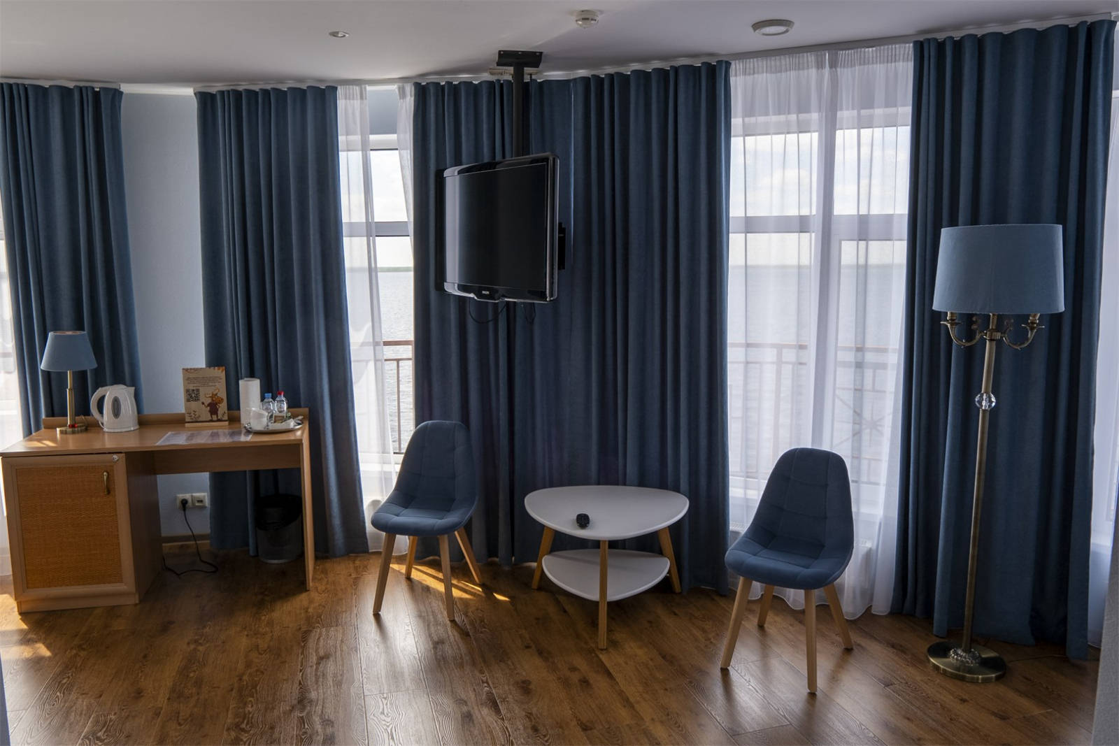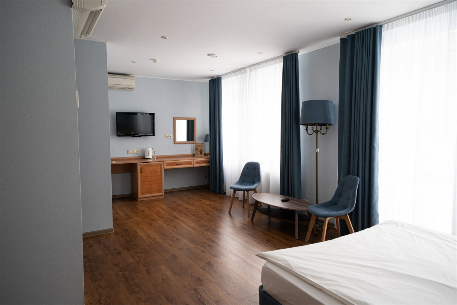 Номер оснащен телевизором и удобной современной мебелью, обеспечивая гостям комфортные условия для отдыха и рабочих моментов.