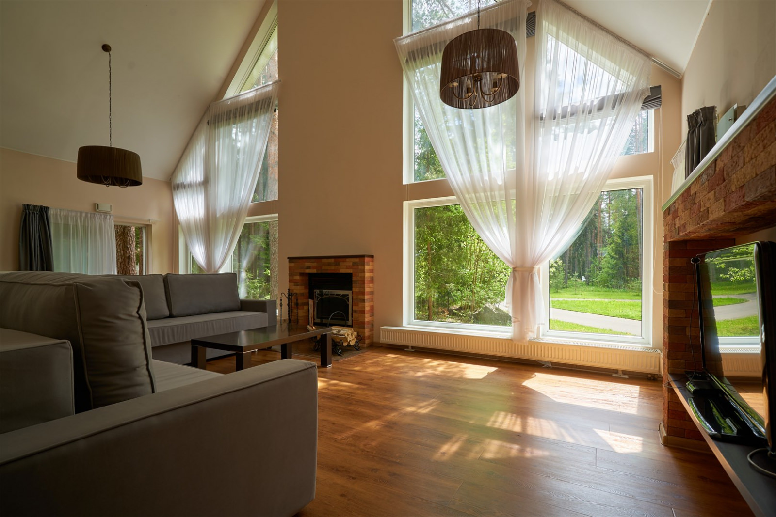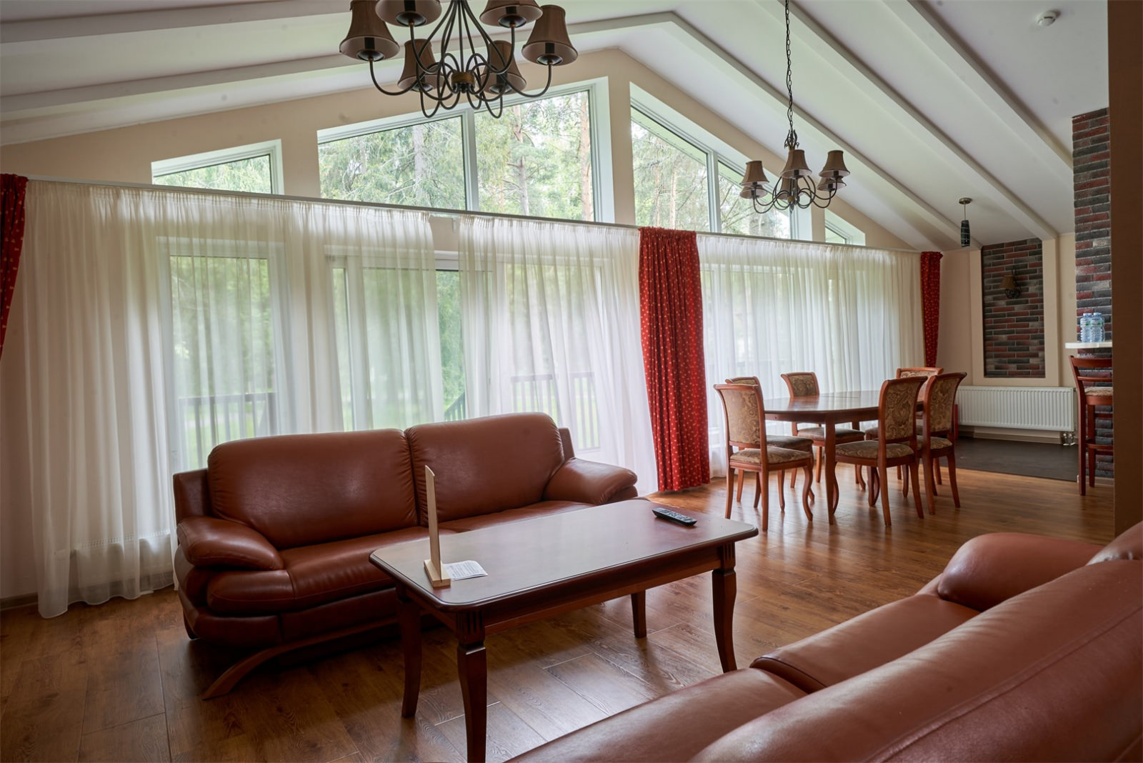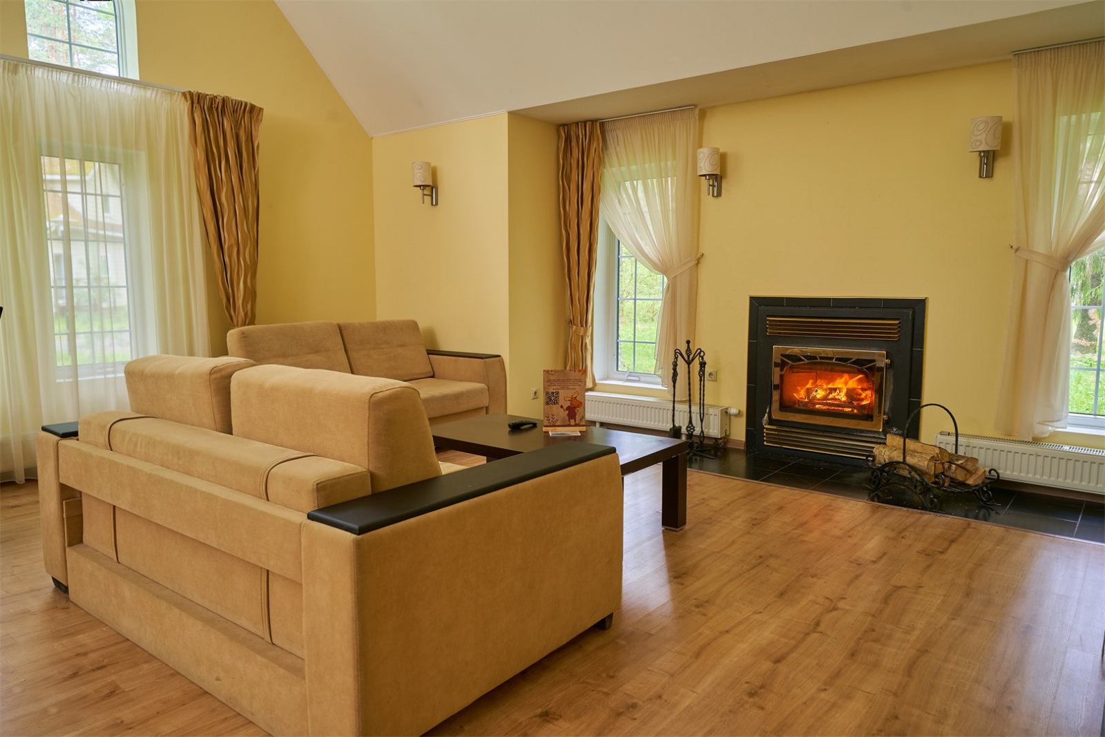 Коттедж имеет площадь 250 кв. метров, вмещает до 10 человек, имеет просторную и оригинально остекленную гостиную, а также оборудован отличным камином.