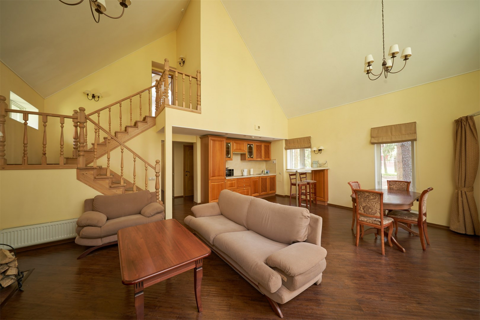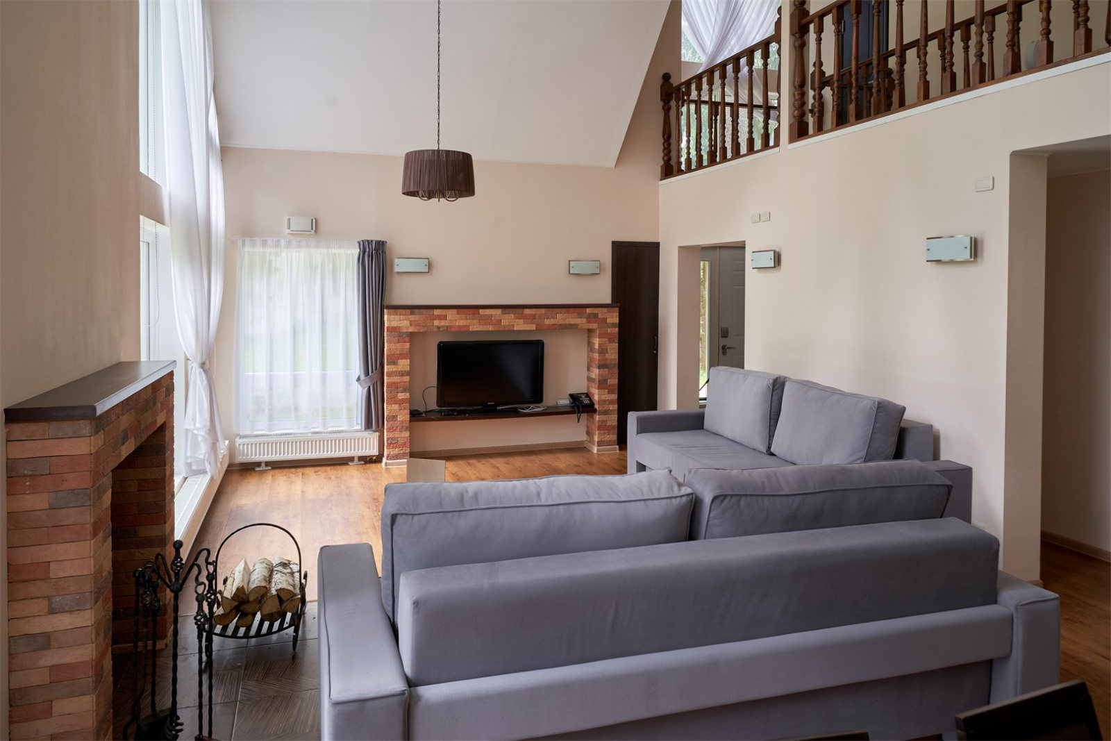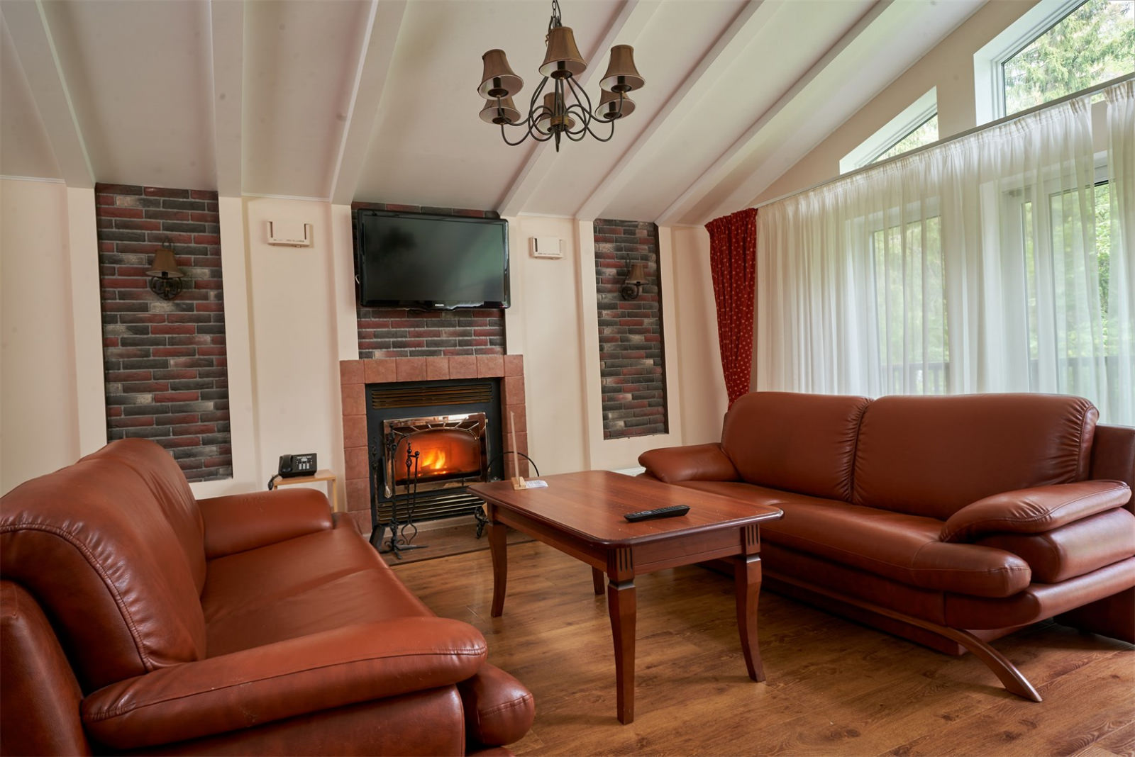 Коттедж имеет площадь 250 кв. метров, вмещает до 10 человек, имеет просторную и оригинально остекленную гостиную, а также оборудован отличным камином.