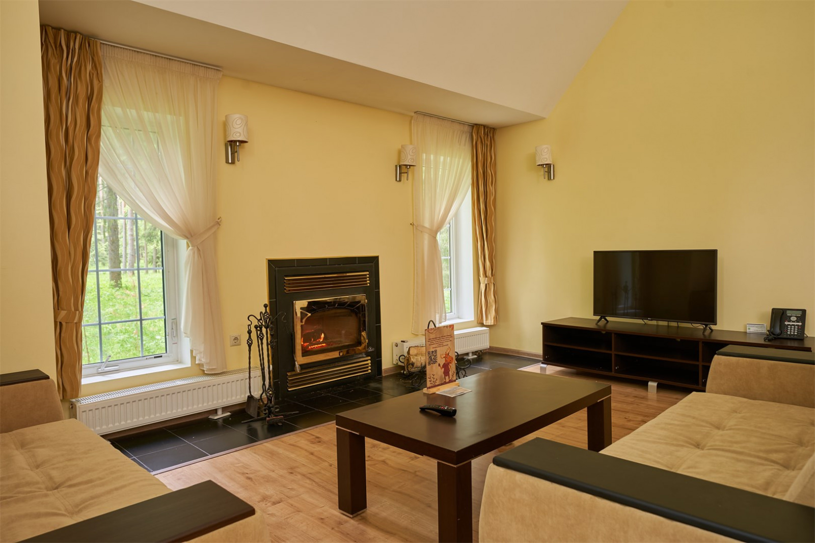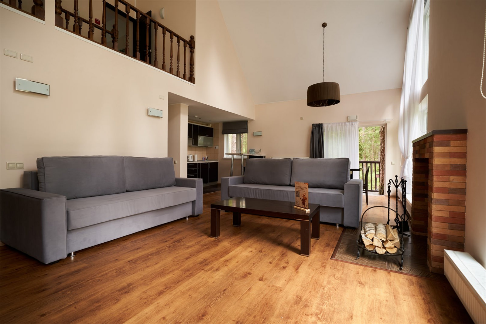 Коттедж имеет площадь 155 кв. метров, вмещает до 6 человек, имеет просторную гостиную и оборудован камином.