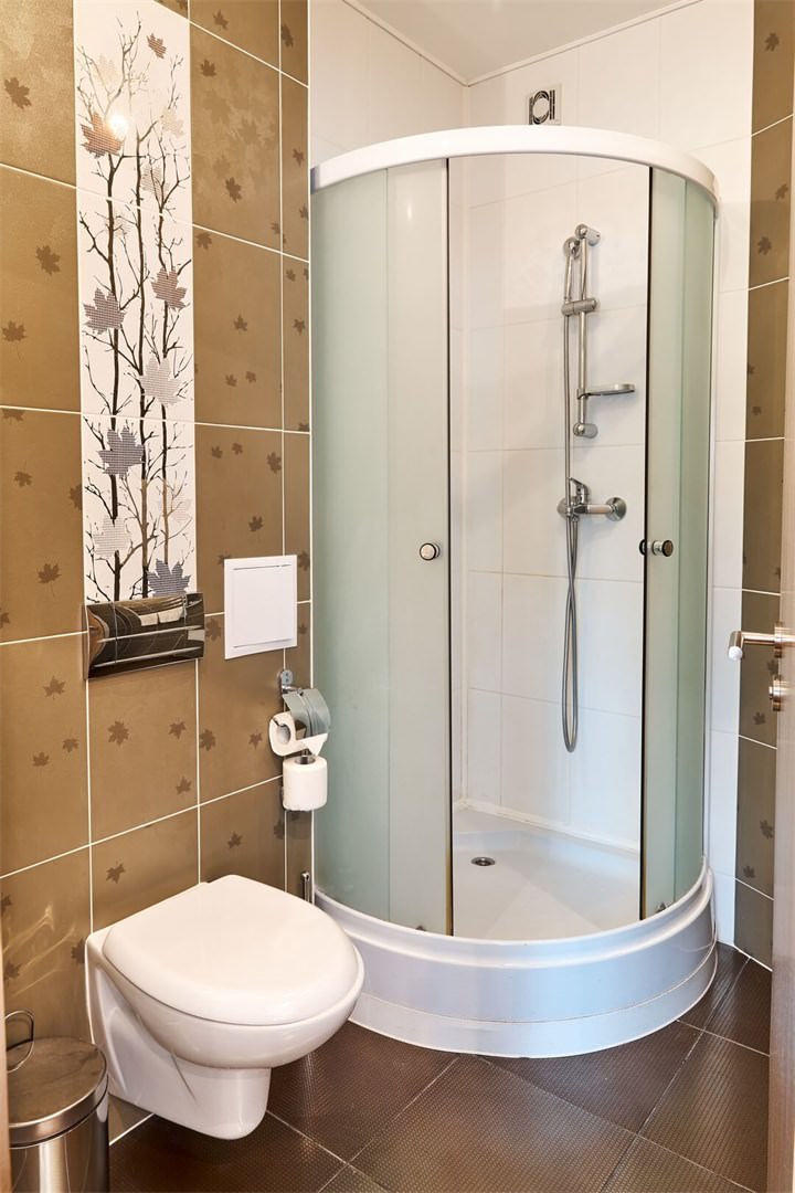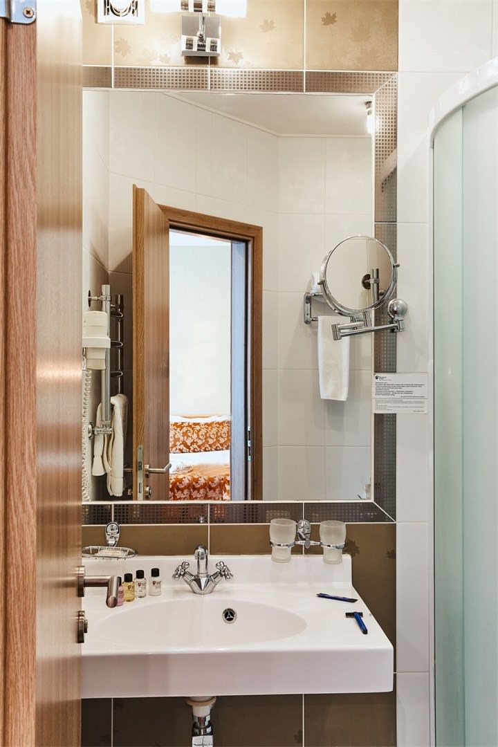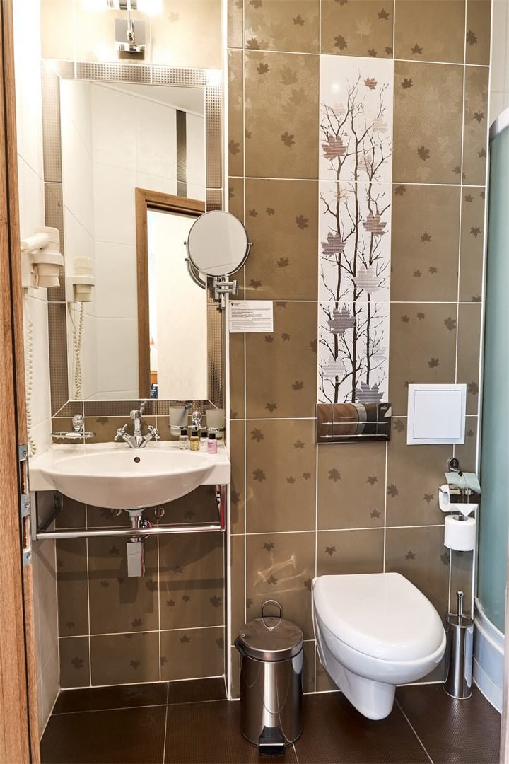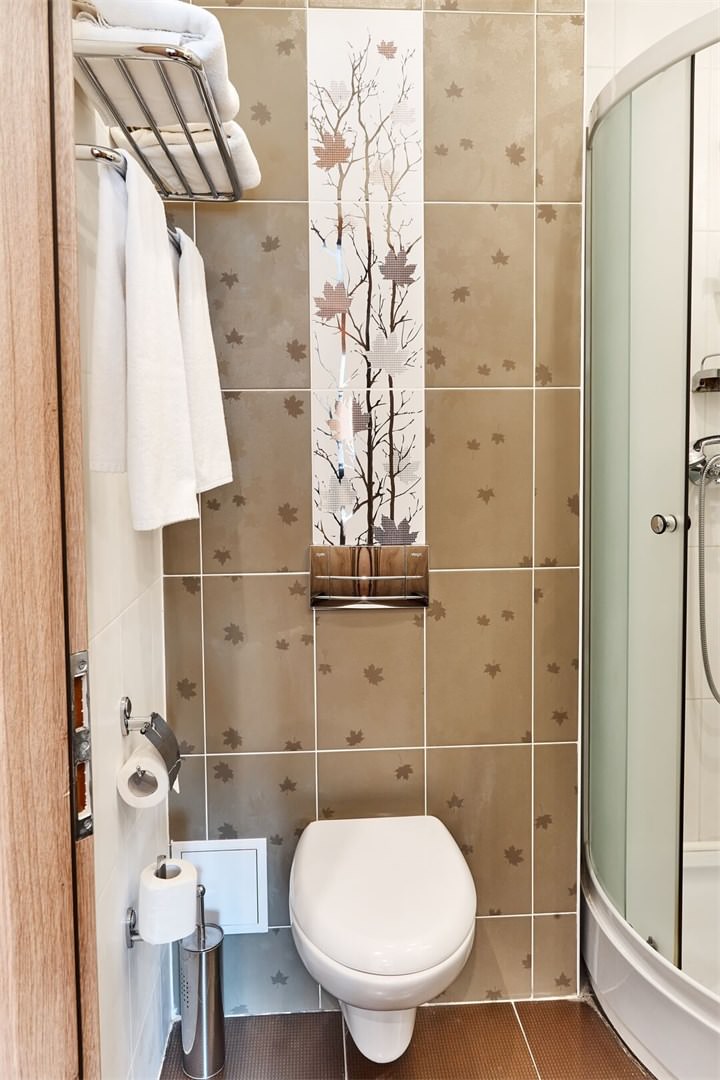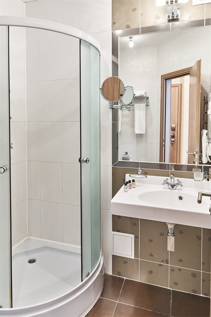 Санузел в номере оборудован душевой кабиной, а само помещение имеет приятное классическое оформление.