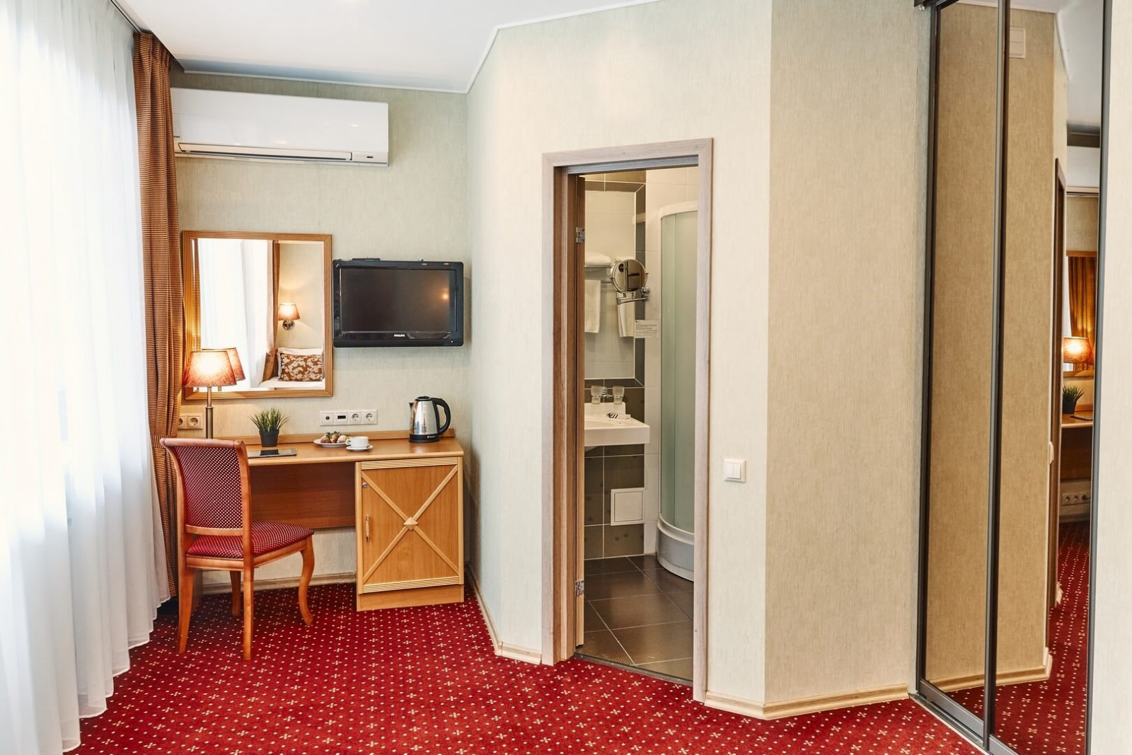 Помещение номера оформлено в классическом стиле с преобладанием светлых оттенков, есть телевизор и удобная мебель, а санузел оборудован душевой кабиной.