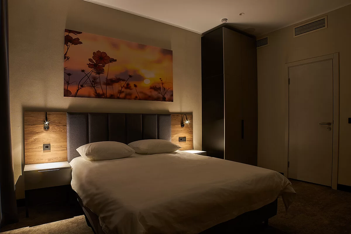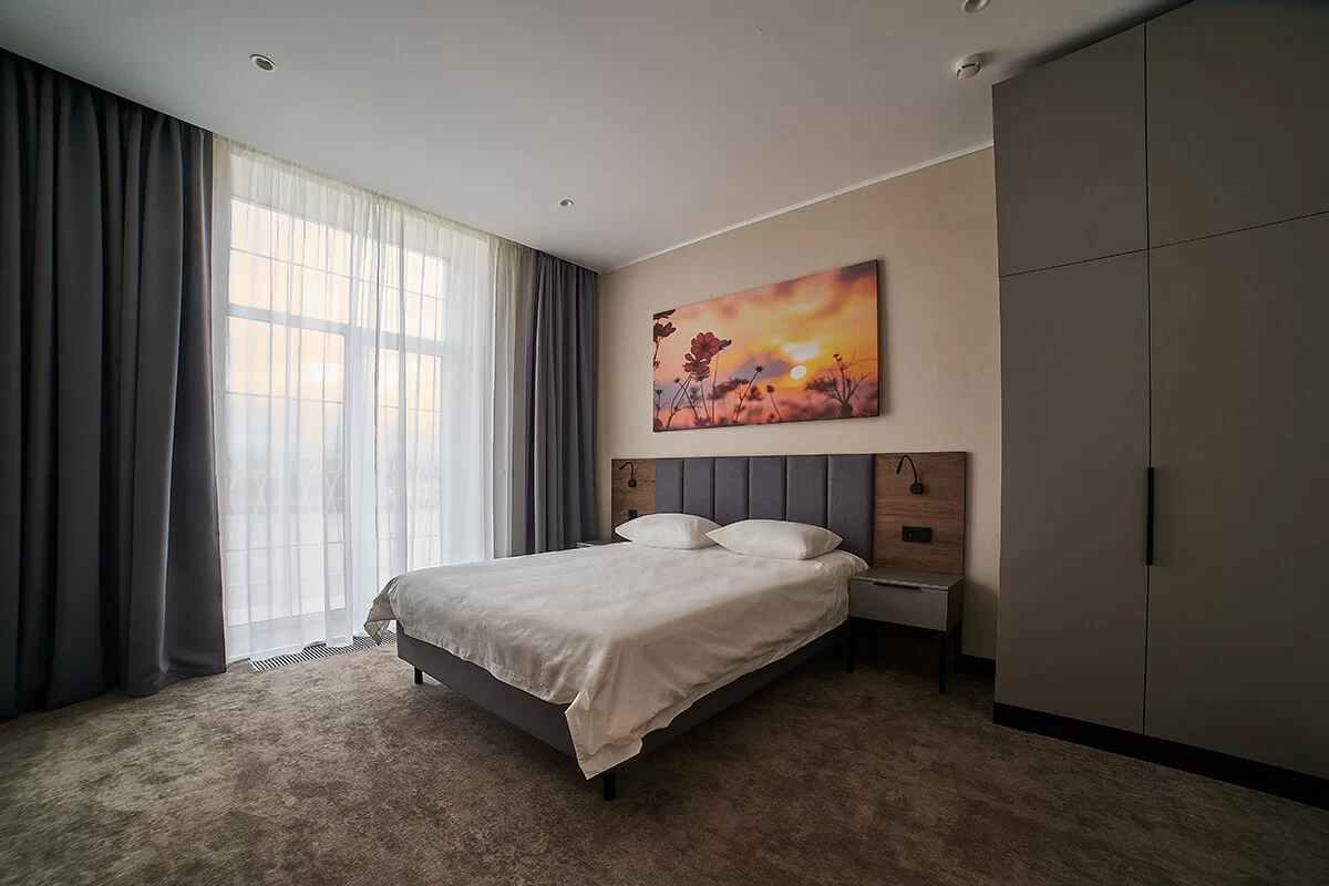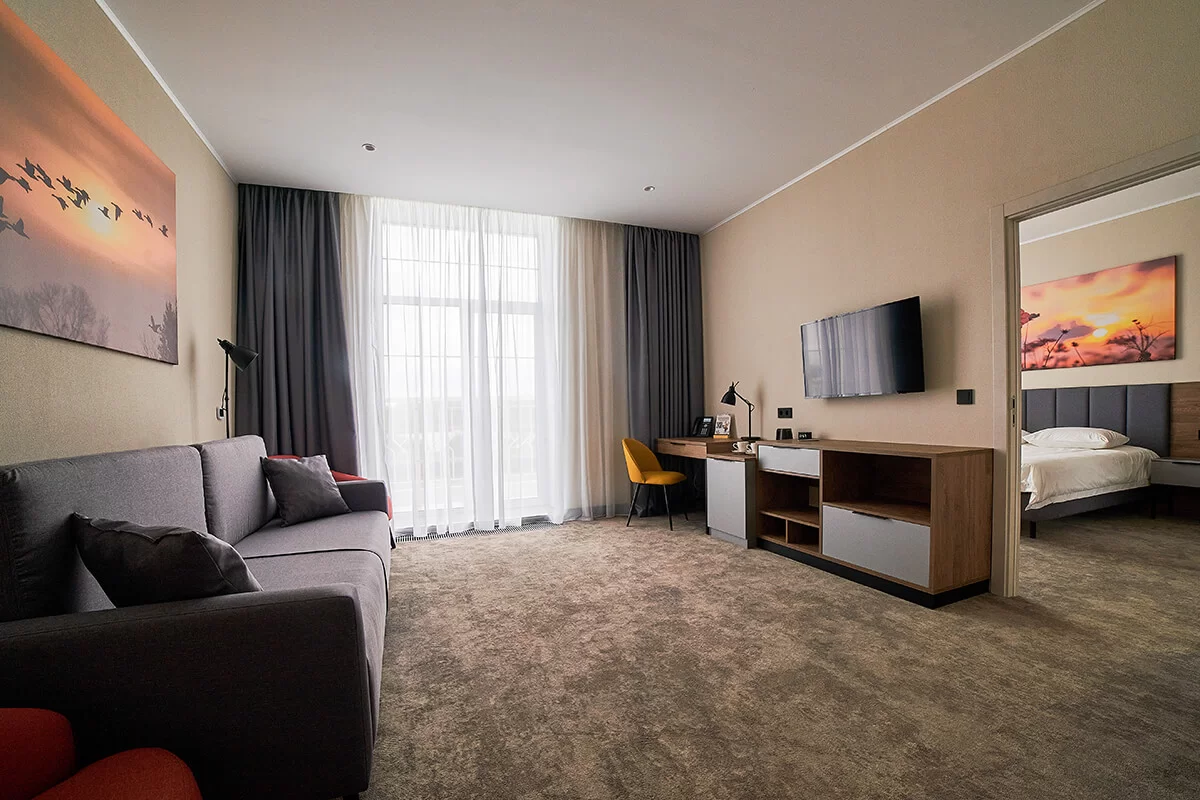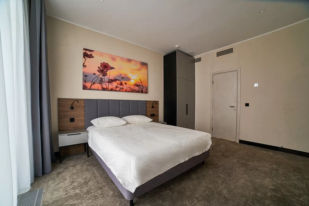 Он состоит из просторной спальни и светлой гостиной, в которой находится удобный раскладной диван. Отличившимся современным дизайном и уютным пространством, этот номер предоставляет своим гостям максимальный комфорт и уют.