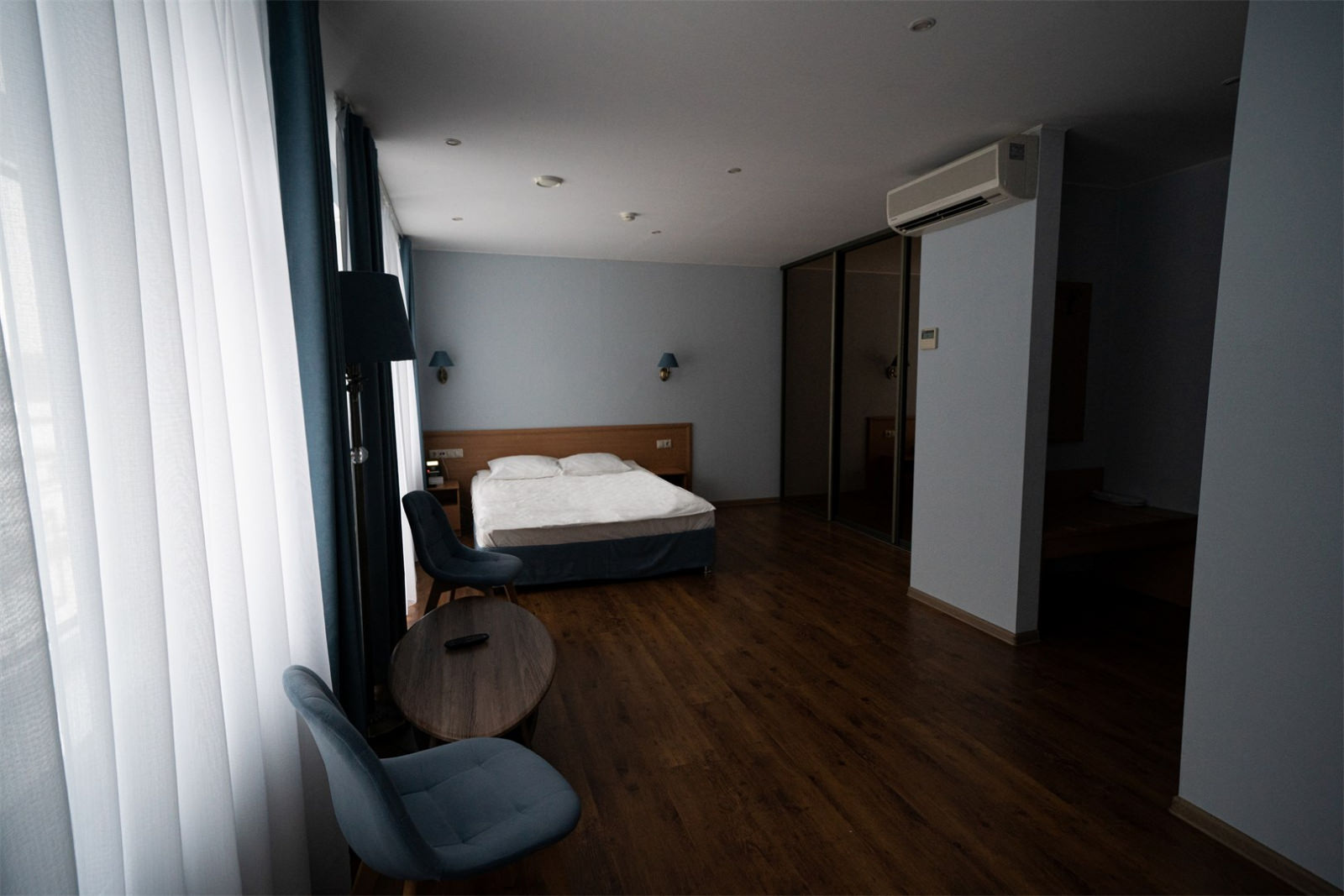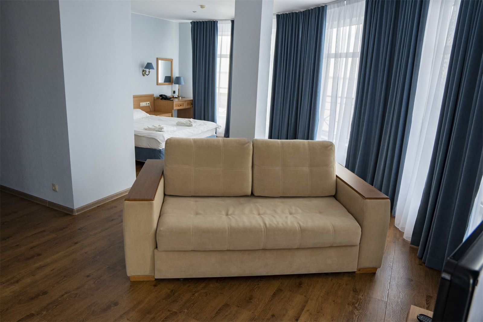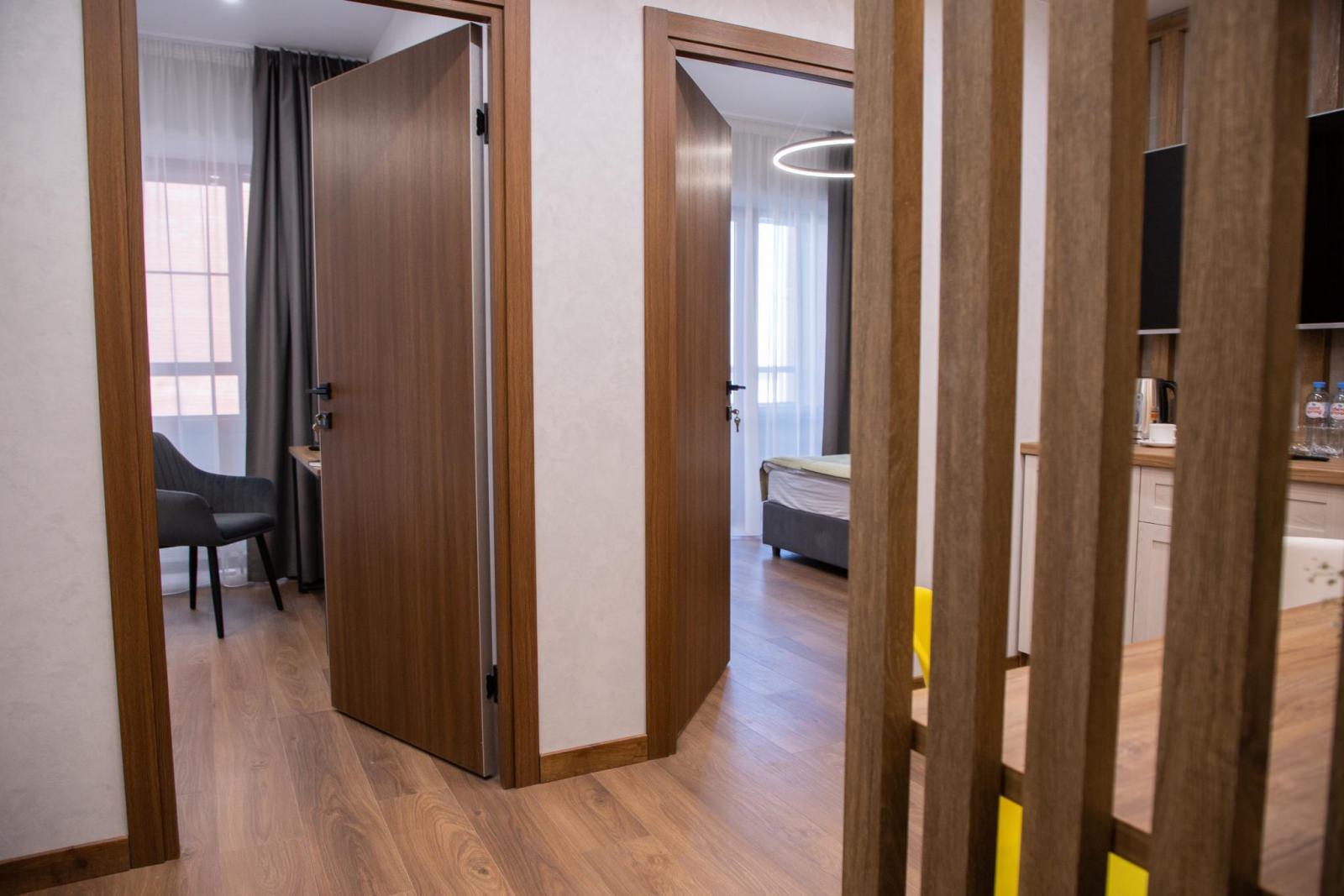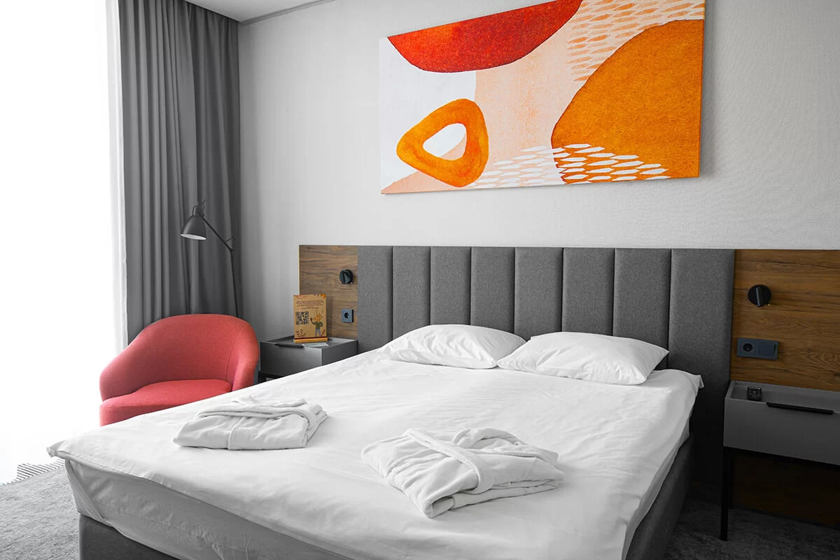 Он состоит из просторной спальни и светлой гостиной, в которой находится удобный раскладной диван. Отличившимся современным дизайном и уютным пространством, этот номер предоставляет своим гостям максимальный комфорт и уют.