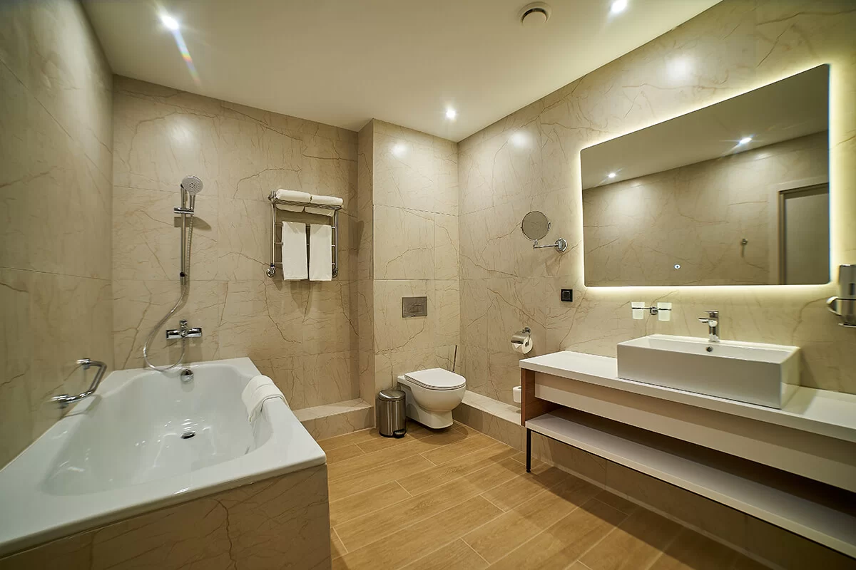 Вас ожидает уютный и роскошный номер, идеально подходящий для романтических пристанищ или отдыха вдвоем, в пространстве 24 кв. м. Интерьер номера оформлен в классическом стиле, создавая атмосферу теплоты и комфорта.